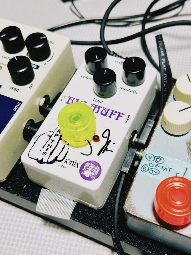 「ビッグマフのボリュームを下げるために歪みのペダルをかます」とか、一見するとクレイジーなことしか言ってないように見えるこの解説を悪い頭をひねって参考にしつつ、スタジオ練習で徐々に音作りをしたのでした。