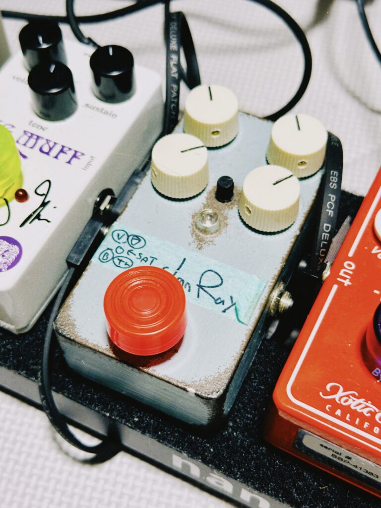 白いのが、エレハモJマスシスシグネイチャーのRam’s Head。バッキング用の歪み。乱暴だけどクリーミー。ヘッドルームが狭めで良くも悪くもコンプ感があるので、歌の後ろでも使いやすい。