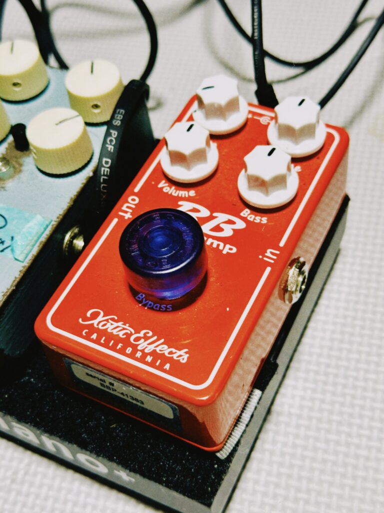 限りなくクリーントーンで、できる限りボリュームをあげたマーシャルに、XOTIC BB Preampをかけっぱなし。ボリュームは抑えめで軽ーく基本の歪み、サチュレーションをつくりまして。